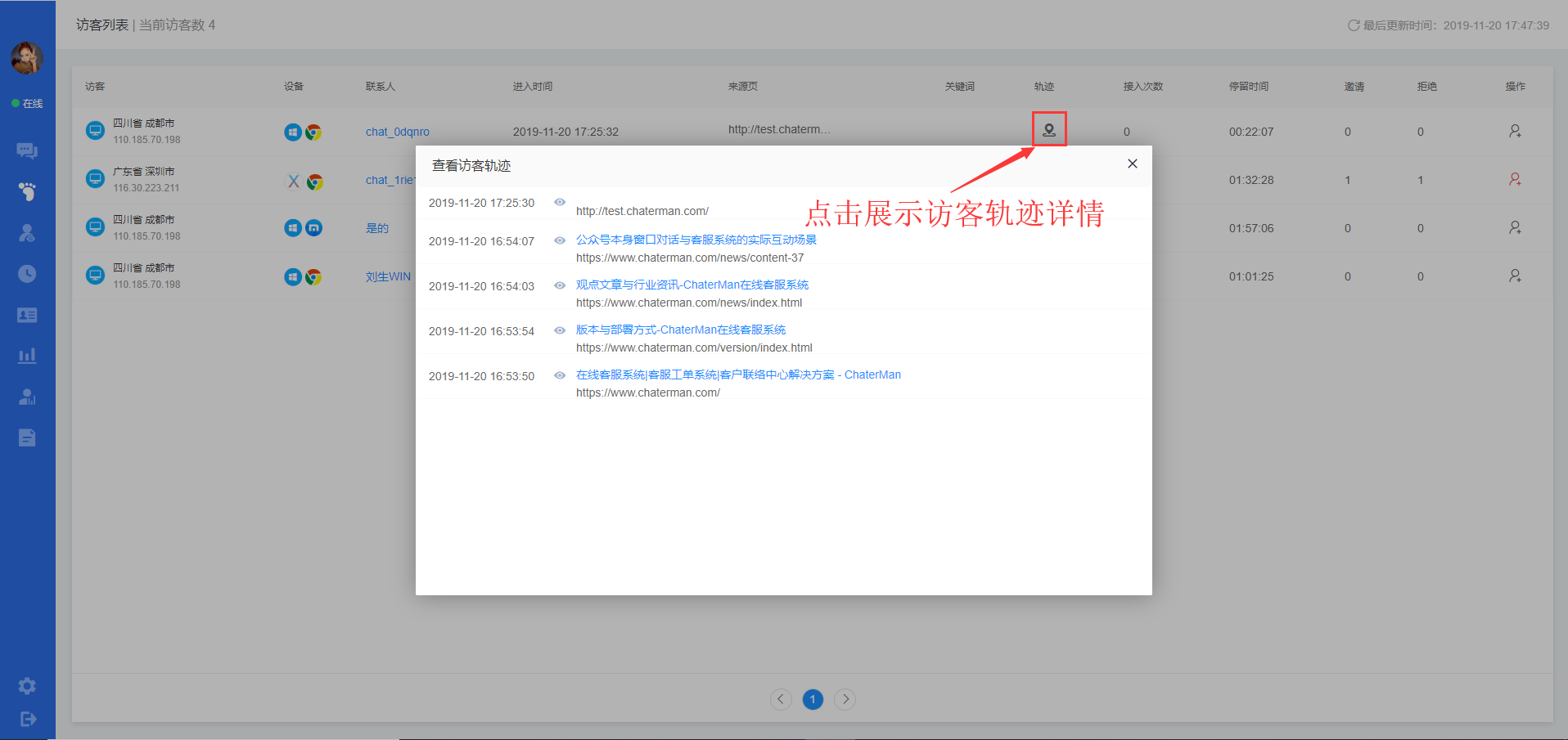 对于以售前为主的客服人员实际应用来讲,其实我们还应该了解访客的轨迹详细轨迹信息,这样综合访客搜索的关键词,我们就能大概的了解访客想要咨询的产品,感兴趣的内容,做相应的引导。最起码保证了客服人员在未与访客有实质性接触之前,可以做一些基础的判断来帮助我们转化线索,同时访客的轨迹数据也可以帮助网站产品等岗位人员做相应的优化。