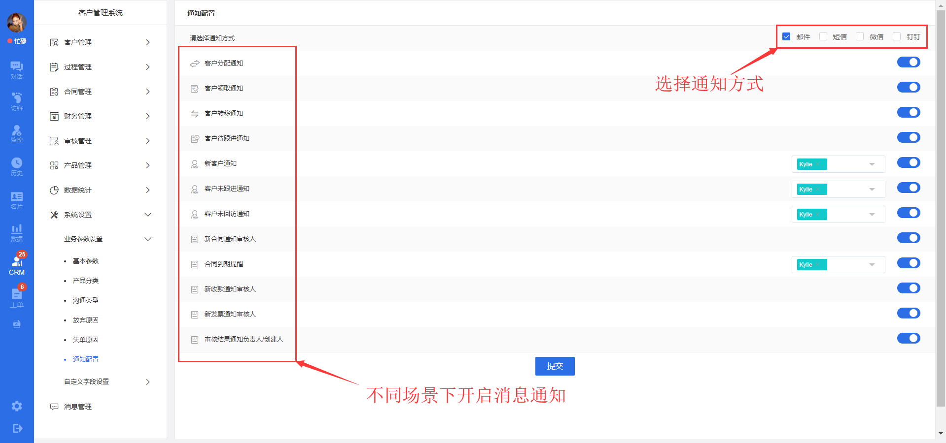 二、通知场景:对企业复杂的流程与客户管理来讲,里面细分的应用场景将会存在多种,这么多种应用场景有些可能不是企业关注的,有些则是必须要第一时间作出应对措施的,那么我们选择适合自己的场景开启消息通知,不需要的则关闭通知,不让杂乱的信息扰乱我们的工作。